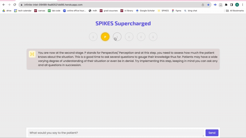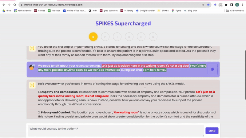 SPIKES Supercharged is a GPT-4 powered training tool designed to help medical professionals practice delivering difficult news to patients with empathy. Built as part of my Human-Centered Computing graduate research, this project combines medical training frameworks with large language models to explore how AI can support empathetic doctor–patient communication.